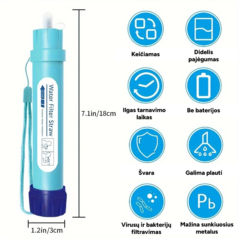 Ellujääv veefilter hädaolukordadeks. See veefiltri kõrs on SGS rahvusvahelises laboris testitud ja materjal vastab WHO standarditele. Kui soovite lihtsalt ja kiiresti puhast joogivett, saate seda ellujäämisveefiltrit kasutada. Kaasaskantav süsteem sobib ideaalselt vaba aja veetmiseks, matkamiseks ja telkimiseks. See on ka hea kaaslane teie uurimisretkedel, reisimisel ja hädaolukordadeks valmisolekul.